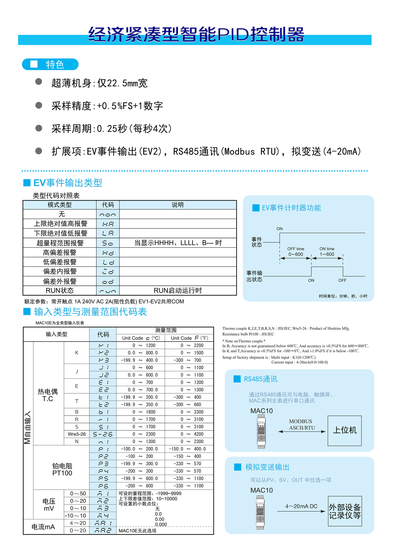 | 可选功能 | 第二路事件报警(EV2) 4-20mA模拟变送输出(AO) |